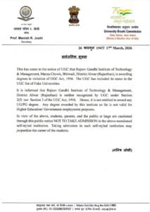 рдЕрд▓рд╡рд░ : рд╡рд┐рд╢реНрд╡рд╡рд┐рджреНрдпрд╛рд▓рдп рдЕрдиреБрджрд╛рди рдЖрдпреЛрдЧ (UGC) рдиреЗ рдЕрд▓рд╡рд░ рдЬрд┐рд▓реЗ (рднрд┐рд╡рд╛рдбрд╝реА) рдореЗрдВ рд╕реНрдерд┐рдд рд░рд╛рдЬреАрд╡ рдЧрд╛рдВрдзреА рдЗрдВрд╕реНрдЯреАрдЯреНрдпреВрдЯ рдСрдл рдЯреЗрдХреНрдиреЛрд▓реЙрдЬреА рдПрдВрдб рдореИрдиреЗрдЬрдореЗрдВрдЯ рдХреЛ рдлрд░реНрдЬреА рдШреЛрд╖рд┐рдд рдмрддрд╛рдпрд╛ рд╣реИ. рдпреВрдЬреАрд╕реА рдиреЗ рд╢рдирд┐рд╡рд╛рд░ рд╕реБрдмрд╣ рдЕрдкрдиреЗ рдЖрдзрд┐рдХрд╛рд░рд┐рдХ ‘рдПрдХреНрд╕’ рдЕрдХрд╛рдЙрдВрдЯ рдкрд░ рд╕рд╛рд░реНрд╡рдЬрдирд┐рдХ рдиреЛрдЯрд┐рд╕ рдЬрд╛рд░реА рдХрд░ рдЫрд╛рддреНрд░реЛрдВ рдФрд░ рдЕрднрд┐рднрд╛рд╡рдХреЛрдВ рдХреЛ рд╕реВрдЪрд┐рдд рдХрд┐рдпрд╛ рд╣реИ рдХрд┐ рдЗрд╕ рд╕рдВрд╕реНрдерд╛рди рдореЗрдВ рджрд╛рдЦрд┐рд▓рд╛ рд▓реЗрдирд╛ рдЙрдирдХреЗ рднрд╡рд┐рд╖реНрдп рдХреЗ рд╕рд╛рде рдЦрд┐рд▓рд╡рд╛рдбрд╝ рд╣реЛ рд╕рдХрддрд╛ рд╣реИ.